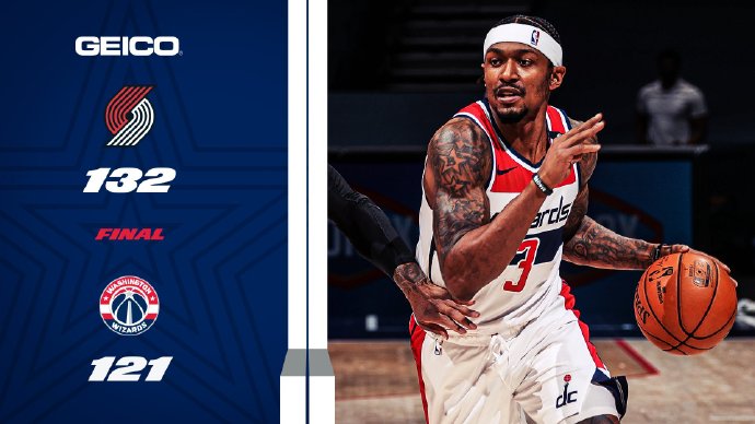 奇才(4-13):比尔37分4助攻,威少17分12篮板10助攻,八村垒24分5篮板,阿夫迪亚13分7篮板3助攻,贝尔坦斯6分,史密斯3分5篮板9助攻,马修斯11分。