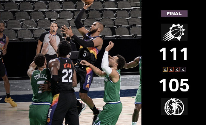 独行侠今日坐镇主场迎来太阳的挑战,独行侠近期状态糟糕遭遇4连败,而太阳太阳则在上一场击败勇士结束3连败,不过球队核心布克因伤继续缺席。上半场的比赛双方激战难分高下,次节独行侠依靠着连续冲击篮下的进攻一度拉开比分,但最后时刻太阳迅速找到感觉并回敬11-3的攻势追平比分结束上半场。下半场之争东契奇开局突然爆发独砍11分,独行侠凭借一波15-2的最多取得15分的领先,但后半节局面急转直下突然哑火,这也给了太阳替补阵容追分的机会,末节初太阳再送8-0的攻势扭转局势,随后的拉锯战里保罗展现关键险胜的作用,他在最后时刻送出8分2次助攻,太阳最后时刻送出15-3的攻势奠定胜局。最终,太阳客场击败独行侠,并送独行侠5连败。