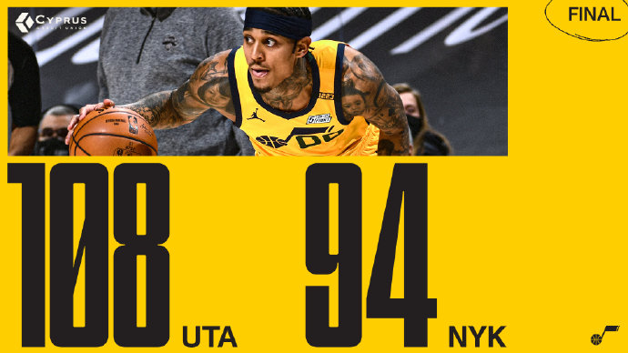 爵士坐镇主场迎战尼克斯,上半场尼克斯杀出奇兵,替补上场的小里弗斯里突外投独砍25分,率领尼克斯在半场战罢以59-46建立起两位数领先。易边再战,爵士找到手感,康利、博格丹诺维奇和米切尔等连中三分,爵士凭借这波三分雨抹掉分差。末节爵士延续手感火热手感,奥尼尔等连续得分,帮助球队反超比分。而尼克斯则命中率暴跌,整个下半场仅得到35分。最终,爵士以108-94逆转尼克斯,豪取9连胜,同时送给尼克斯3连败