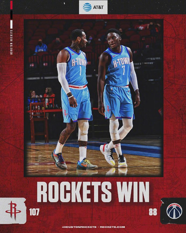 NBA常规赛火箭主场对阵奇才,火箭近来状态稳定取得2连胜。开场后比尔和威少帮助奇才取得领先,沃尔凭借个人能力为火箭紧追不舍,第二节上来戈登为火箭吹起反击的号角,火箭一鼓作气完成反超,不过奇才也是多次尝试缩小分差,上半场过后,火箭56-52领先奇才。下半场回来两队手感不佳频频打铁,比尔带领奇才一度完成反超,但是戈登及时站出来帮助火箭重新获得优势,第四节后半段火箭打出一波高潮锁定胜局,最终火箭107-88击败奇才取得3连胜。