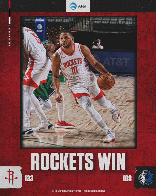 独行侠坐镇主场迎战火箭,两队都是背靠背作战,此役沃尔伤愈复出,波尔津吉斯则因伤病管理缺阵,鲍威尔、约什-理查德森等因健康安全协议缺阵。本场比赛考辛斯梦回巅峰开场即迅速进入状态频频砍分,率领火箭早早就建立起两位数领先。易边再战,考辛斯延续手感和戈登在第三节带队再打出高潮进一步拉开比分,缺兵少将的独行侠在攻防两端全面处在下风,比赛悬念提前失去。最终,火箭在客场以133-108大胜独行侠,取得2连胜。