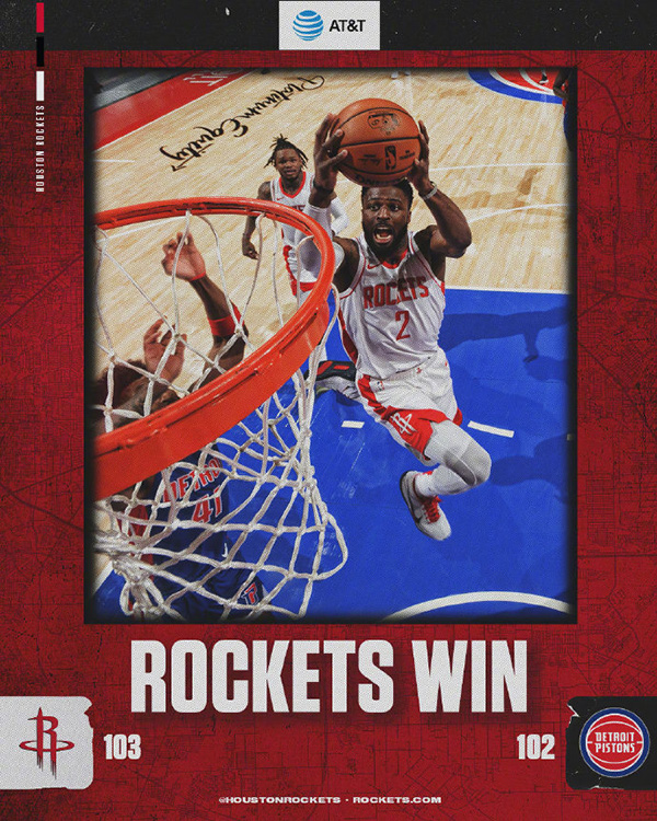 火箭前往客场挑战活塞,此役沃尔和伍德因伤缺阵。首节火箭迅速找到手感,考辛斯、塔克和泰特等连中三分,帮助火箭建立起两位数领先。不过,活塞之后进入状态,格兰特、艾灵顿等里外开花连续砍分,率领活塞在第三节成功反超比分。末节活塞未能延续手感突然哑火,火箭趁机重新夺回领先。比赛最后,格兰特连续砍分率领活塞追分争取绝杀机会,可惜最后一攻突破上篮超时无效。最终,7人上双的火箭以103-102惊险获胜,止住3连败颓势。