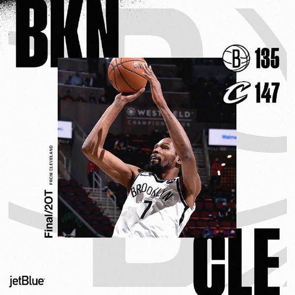 篮网前往客场挑战骑士,此役欧文复出,篮网三巨头首次齐登场。首节开局欧文状态火热连续得分,帮助篮网先拔头筹,可是篮网之后命中率下滑,骑士在奥斯曼的带领下回敬一波14-0反超比分。虽然篮网三巨头之后站出来轮番得分,但是骑士亦延续手感,塞克斯顿、德拉蒙德和奥斯曼频频砍分还以颜色,帮助骑士一路保持着领先。不过,篮网在末节展开疯狂反扑,杜兰特、哈登和欧文火力全开率队成功扳平比分,把比赛拖入加时。加时赛里,欧文和杜兰特连续砍分帮助篮网取得领先,但塞克斯顿在关键时刻命中三分把比赛拖入第二个加时。第二个加时塞克斯顿大爆发独中4记三分率队拉开比分,最终骑士凭借塞克斯顿的超神发挥以147-135击败篮网,终结对手4连胜。