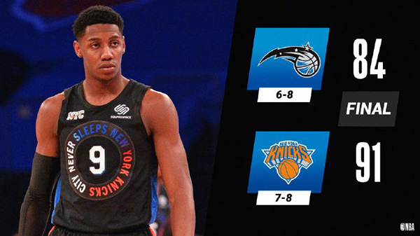 NBA常规赛,尼克斯在主场迎战魔术。首节比赛,魔术全队只有两人有得分进账,以13-19落后。之后的时间,尼克斯最多时曾将分差拉大到15分,魔术末节发力追分,在泰伦斯-罗斯命中神仙三分后完成反超。关键时刻,兰德尔、巴雷特和布洛克接连得分,尼克斯轰出一波9-0的小高潮取得8分优势拿下比赛。最终,尼克斯在主场以91-84力克魔术,取得两连胜,送给后者六连败。
