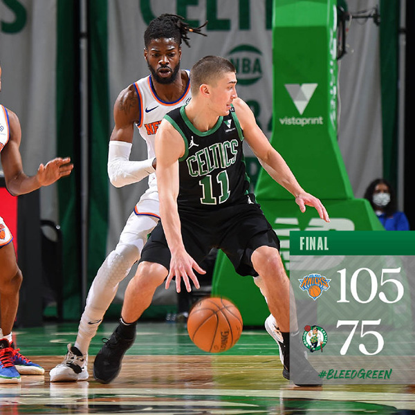 NBA常规赛,凯尔特人坐镇主场迎战尼克斯。此役,绿军主将肯巴-沃克迎来赛季首秀,塔图姆等人缺阵。首节比赛,杰伦-布朗高效拿下11分,但绿军其他球员合计仅得6分,而尼克斯双星兰德尔和巴雷特合砍19分10板,带队以28-17领先。第二节,尼克斯新秀奎克利表现出色,他连连得分帮助尼克斯打出进攻高潮,一举将分差拉大到15分。下半场开局,尼克斯再度轰出攻击波,把领先优势扩大到20+!而刚刚复出的沃克一度因伤返回更衣室,好在没有大碍,本场未继续出战。末节比赛沦为垃圾时间,尼克斯最终在客场以105-75大胜凯尔特人,结束五连败,并终结对手的五连胜。