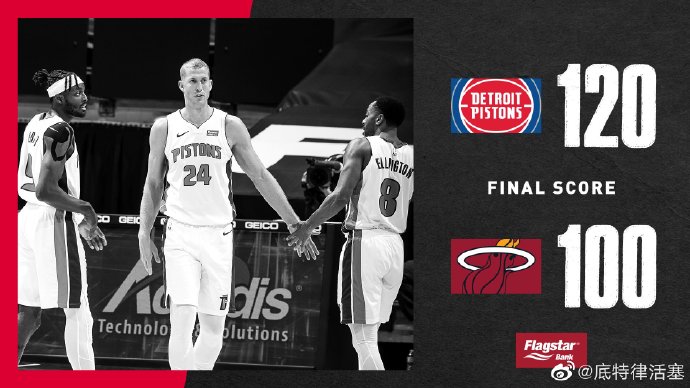 热火坐镇主场迎战活塞,此役巴特勒、希罗因健康协议缺阵。两队上半场打得十分胶着,热火凭借纳恩和阿德巴约在次节末连续得分,以56-52稍稍领先结束半场。易边再战,热火在第三节命中率下滑,活塞则找到外线手感,格兰特、格里芬和罗斯等连中三分,活塞凭借凶猛的外线火力单节净胜19分,取得两位数领先。末节热火仍未找回进攻节奏,而活塞延续着手感,罗斯、约什-杰克逊和贝等一众替补再轰进三分,帮助活塞把领先扩大到20分以上,就此锁定胜局。最终,活塞在客场以120-100大胜热火,止住2连败的颓势,同时送给热火3连败。