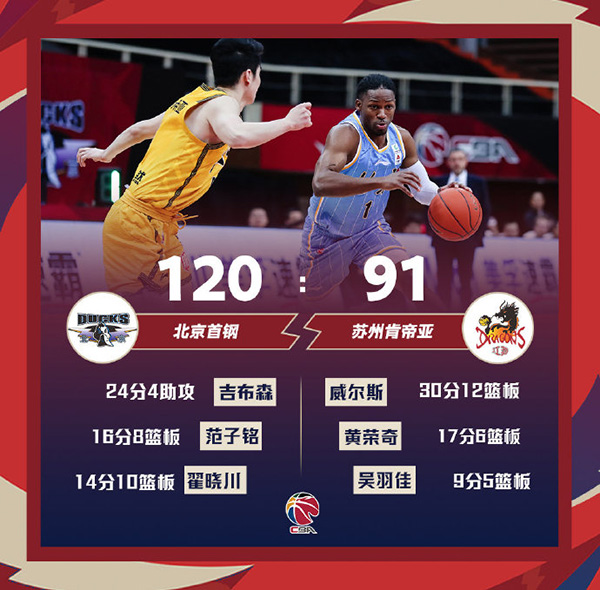 CBA常规赛今日继续进行,北京对阵江苏,首节比赛北京就展现出了强大的进攻火力,凭借在内线的优势保持大比分领先,首节结束北京38-22领先江苏,次节再战,北京继续依靠自己的内线优势扩大领先,随后外线火力全开,分差来到30分以上,本节后半段北京保持优势,江苏只能凭借外援威尔斯的零敲碎打得到分数,半场结束,北京78-44领先江苏。易边再战,北京外线失准,江苏趁机打出一波11-0缩小差距,此时汉密尔顿站出来稳住局势,两队分差在三十分上下浮动,来到本节末段北京外线再度开火扩大优势,三节结束,北京102-65领先江苏。最终决战,面对北京内线优势,江苏无计可施,随着本节中段王晓辉又一记三分入网,分差来到40分,随着时间推移,比赛早早失去悬念,最终全场比赛比赛结束,北京120-91大胜江苏止连败。