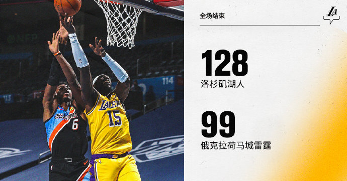 湖人前往客场挑战雷霆,两队都是背靠背作战。上半场浓眉在内线频频得手,詹姆斯连中三分,两人率领湖人早早就建立起两位数领先。易边再战,湖人延续着手感,浓眉和詹姆斯继续予取予求,哈雷尔等角色球员亦连续砍分,多点开花的湖人把领先扩大到20分以上,攻防两端全面处在下风的雷霆毫无抵抗之力。最终,6人得分上双的湖人兵不血刃地以128-99大胜雷霆,取得4连胜。