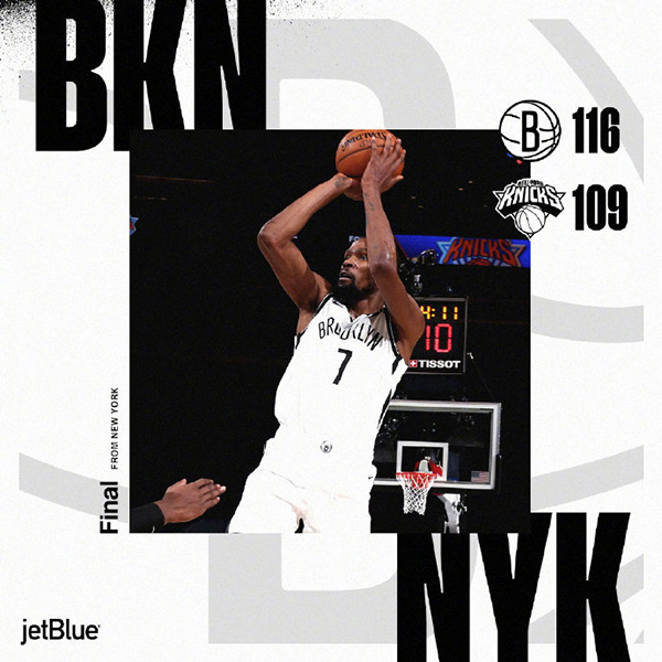 [微博全场集锦] 杜兰特26+6 兰德尔30+7 篮网7人上双送尼克斯4连败