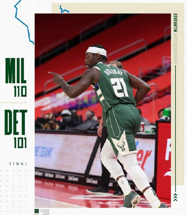 [微博全场集锦] 字母哥22+10+10 霍勒迪21+6 雄鹿击败活塞取3连胜