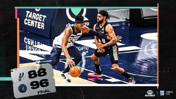 NBA常规赛马刺再战森林狼,上次双方的交手马刺经过加时获得险胜,森林狼目前遭遇7连败,本场比赛德罗赞和唐斯双双缺阵。本场比赛开始后拉塞尔连续三分帮助森林里抢得先机,不过沃克接连杀入内线追分,第二节森林狼仍旧主要杀入内线,不过马刺一波高潮完成反超,米尔斯和穆雷外线也找到手感连续投篮命中,上半场马刺49-44领先。下半场比斯利接连单打得手帮助森林狼一度反超,不过马刺稳扎稳打再次领先,但第四节森林狼再次掀起反扑完成反超,最后关头森林狼顶住压力96-88战胜马刺成功复仇也结束7连败。