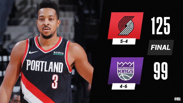 开拓者(5-4):麦科勒姆37分3板3助2断,利拉德17分4板6助,安东尼13分2板,坎特11分15板,特伦特10分2板,努尔基奇10分8板5助,考文顿6分8板4助,琼斯9分2板,西蒙斯6分。