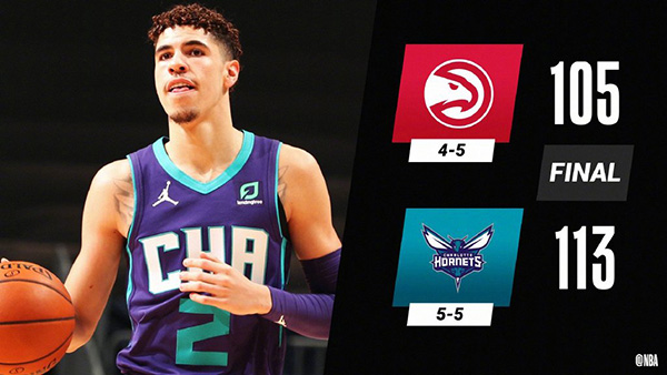 黄蜂背靠背回到主场迎战最近更衣室不和的老鹰,首节两队打得十分胶着、场上比分交替领先,但老鹰在次节命中率下滑,且博格达诺维奇受伤离场;而鲍尔则为黄蜂连续砍分,帮助黄蜂以59-50领先结束上半场。易边再战,鲍尔延续着良好状态,他频频得分并送出助攻,成功打出生涯首个三双,成为历史最年轻三双先生。黄蜂在鲍尔的带领下一路保持着领先,最终以113-105击败老鹰,取得3连胜的同时,送给老鹰4连败。
