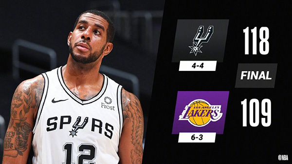 湖人坐镇主场迎来马刺的挑战,马刺上一场击沉快船结束4连败,湖人则延续状态目前豪取4连胜。上半场的马刺反客为主早早进入状态,凭借着双德首节合力攻下24分,马刺抢得先机取得8分领先,次节湖人仍然阻止不了马刺的进攻,马刺半场高效率命中10记三分,球队凭借出色的内外结合保持9分领先进入下半场。第三节湖人末段发力并送出15-5的攻势抹平比分看到希望,然而他们第四节初又一次哑火,盖伊连砍8分成为关键先生,马刺送出一波11-4的攻势重新取得两位数的领先奠定胜局,最终,马刺客场击败湖人并终结对手4连胜。