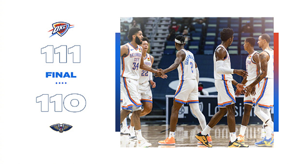 NBA常规赛雷霆对阵鹈鹕,两队上场比赛都遭遇失利。开场后雷霆外线连中三分,不过锡安和亚当斯优势明显帮助鹈鹕取得领先,随后鹈鹕外线也打开局面,第二节两队先后打出攻势,上半场结束,鹈鹕59-54继续领先雷霆。下半场回来贝兹利独得11分帮助雷霆反超,虽然锡安和英格拉姆轮番为鹈鹕追分,不过亚历山大也状态神勇为雷霆保持优势,最后一节锡安和亚当斯利用内线优势帮助鹈鹕一度夺回领先,不过乔治-希尔最后造到犯规两罚全中,鹈鹕绝杀未果,最终雷霆111-110险胜鹈鹕。