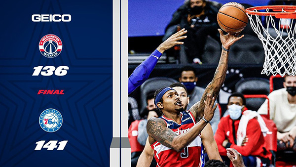 奇才:比尔60分7板5助,布莱恩特11分6板,八村塁8分2板,威斯布鲁克20