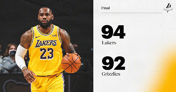 [微博全场集锦] 詹姆斯26+11+6 戴维斯26+10 湖人力克灰熊取4连胜