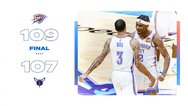 NBA常规赛雷霆客场挑战黄蜂,这是雷霆新赛季第一场正式比赛。开场后两队就打得个势均力敌,鲍尔一扫上场比赛颓势在首节就表现不错,第二节格拉汉姆突然爆发帮助黄蜂一度领先到11分,但是希尔和亚历山大帮助雷霆追上比分,半场打完,黄蜂59-57领先雷霆。下半场回来黄蜂进攻乏力,虽然雷霆进攻也比较一般但仍旧完成反超,最后一节雷霆依靠三分线外的不错手感将领先巩固在两位数,但是最后时刻布里奇斯三个三分帮助黄蜂在9.7秒的时候追平比分,亚历山大晃开防守跳投命中,最终雷霆109-107击落黄蜂取得赛季开门红。