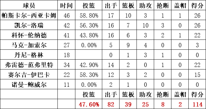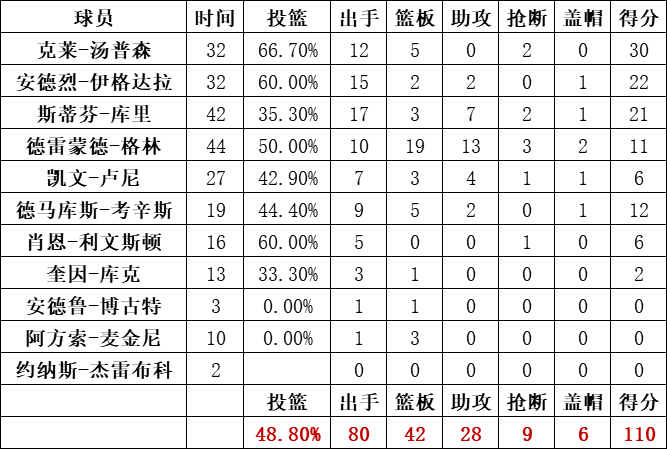 勇士:克莱-汤普森30分5篮板;斯蒂芬-库里21分3篮板7助攻;安德烈-伊格达拉22分;德雷蒙德-格林11分19篮板13助攻;德马库斯-考辛斯12分5篮板。