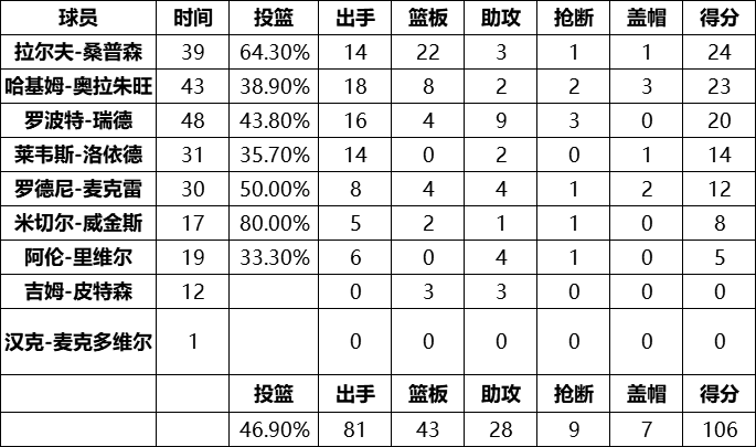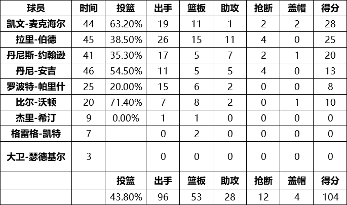 1986年总决赛,凯尔特人带着大比分2-0领先来到休斯顿,拉里-伯德在45分钟的出场时间里拿到了25分15个篮板11次助攻4次抢断的数据,但是他26次投篮仅仅命中10球、投篮命中率仅为38.5%、特别是他擅长的三分球3次出手无一命中,而尽管奥拉朱旺也只有38.9%的投篮命中率,但是拉尔夫-桑普森以64.3%的投篮命中率得到了24分22个篮板,最终凯尔特人以104-106惜败于火箭。