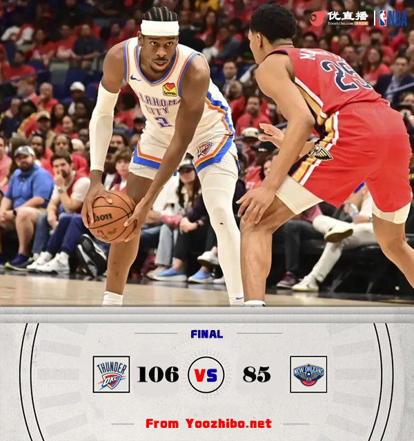 NBA季后赛,雷霆客场挑战鹈鹕。目前总比分雷霆2-0领先。比赛开始,双方开场势均力敌,比分交替领先,雷霆内外开花占据主动,次节前半段双方依旧缠斗,此后雷霆突然发力,三分4连击将分差拉开到两位数,半场战罢雷霆60-46领先14分。易边再战,雷霆牢牢占据场上主动,又是三分3连击扩大优势,鹈鹕强攻内线拿分苦苦支撑,末节雷霆持续发力打出10-2将分差拉开到20分以上,鹈鹕大势已去无力回天。最终,雷霆106-85再胜鹈鹕,总比分3-0领先拿到赛点。