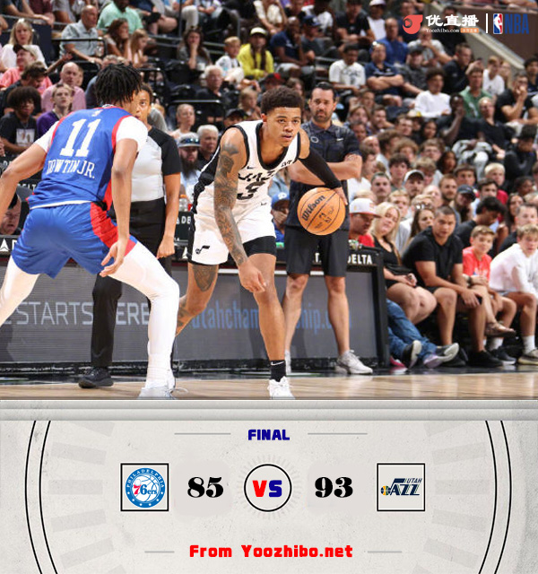 24直播网7月11日讯 NBA盐湖城夏季联赛,76人对阵爵士。一开场,双方势均力敌,比分始终紧咬,爵士内外开花,76人连投带罚打出8-0迅速回应,次节阿鲁玛三分吹响球队进攻的号角,76人持续发力扩大领先,爵士不断冲击篮筐努力追赶,康西尔飙中三分,半场战罢76人44-34领先10分。下半场,爵士大举反击,多点开花不断迫近比分,森萨博反击暴扣带队反超,末节双方争夺陷入白热化,比分交替领先,关键时刻爵士连投带罚确立优势,76人苦苦追赶无果。最终,爵士93-85力克76人。