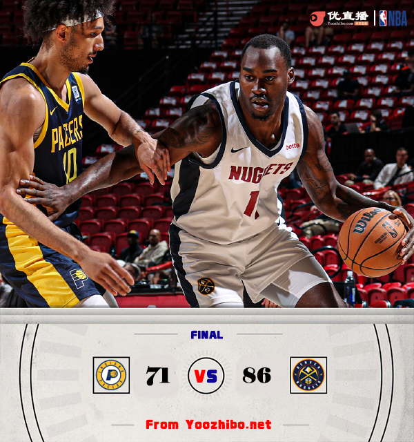 24直播网 7月19日讯 NBA夏季联赛,掘金对阵步行者。比赛开始,掘金轮番冲击篮筐频频得手很快占据主动,步行者连投带罚努力追赶,掘金持续输出保持优势,次节步行者进攻端仍不理想,掘金继续强攻内线连续拿分将分差拉开到19分,牛顿三分止血,半场战罢掘金42-26领先16分。易边再战,双方围绕两位数的分差展开拉锯战,此后掘金命中率下降,步行者连中三分缩小分差,末节两队继续缠斗,掘金连中三分再度将分差拉开到10分以上杀死比赛。最终,掘金86-71击败步行者。