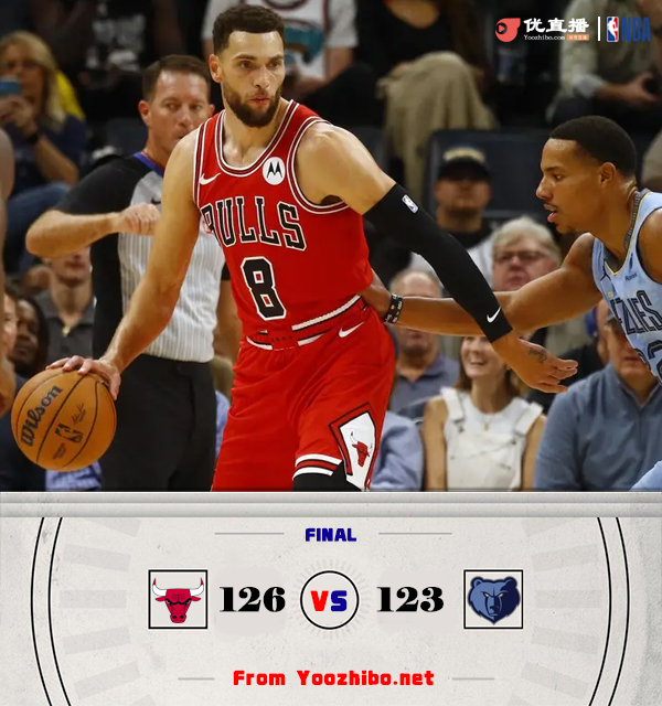 24直播网10月29日讯 NBA常规赛,灰熊主场迎战公牛。上半场,灰熊率先发力,多点开花很快取得两位数领先,次节双方大打对攻,公牛内外开花连续拿分,灰熊不断冲  击篮迅速回应,半场战罢灰熊68-54领先公牛。下半场,双方依旧火力很猛,公牛外线发力连中三分不断缩小分差,末节灰熊命中率下降,公牛持续输出反超比分,灰熊苦苦追赶无果。最终,公牛126-123力克灰熊。