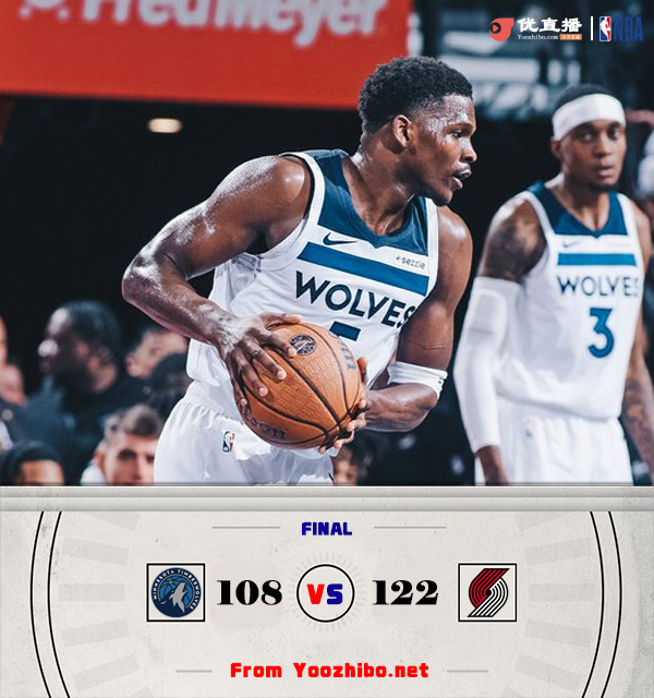 24直播网11月13日讯 NBA常规赛,森林狼对阵开拓者,森林狼上场被热火绝杀,开拓者最近遭遇3连败。开场后两队你来我往还打得势均力敌,不过森林狼第一节末段进攻断电,开拓者趁机建立起两位数领先。第二节爱德华兹带领森林狼找回进攻状态,里德手感火热也是连连砍分,不过开拓者状态也是相当火热,罗威内线活跃多次上演暴扣,班顿外线也是神准。下半场回来两队主力依旧打得势均力敌,开拓者凭借轮换阵容的发挥将分差拉大,森林狼只有里德状态不错。最后一节森林狼再次组织反扑,不过开拓者整体发挥依旧稳定,没有给森林狼追上比分的机会,最终开拓者122-108击败森林狼结束3连败。