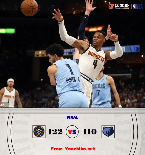 北京时间11月20日讯 NBA杯,灰熊主场迎战掘金,本场比赛双方当家球星莫兰特和约基奇继续缺阵。比赛开始,掘金反客为主先打出9-2开局,灰熊进攻端很是慢热,小波特继续突破打成帮助掘金建立主动权,灰熊替补追分,首节掘金依然领先7分,次节双方展开对攻拉锯战,JJJ陷入犯规麻烦,文斯-威廉姆斯和钱查尔前后受伤,穆雷联手小波特助掘金半场领先11分。下半场,灰熊进攻端突然断电,半节仅得1分,掘金直接一波16-1攻击波拉开至20分以上领先,但灰熊全民皆兵还是追至20分以内分差,末节阿尔达马继续发力里突外投帮助灰熊追分,威少继续助攻,穆雷也能站出来回应,掘金始终保持10分左右领先,威少抢到前场篮板拿到三双,萨里奇三分杀死比赛,最终掘金122-110力克灰熊。
