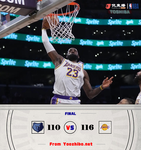 NBA常规赛,湖人主场迎战灰熊,湖人近期状态不佳,近5战1胜4负;灰熊则是士气正佳,近11战10胜,目前也是经历4连胜。本场比赛詹姆斯复出。比赛开始,詹眉联手攻防建功带队打出9-2不错开局,JJJ带队追分,但浓眉内线阻挡不了,湖人接连反击再打8-0拉开双位数领先,首节湖人领先10分,次节莫兰特命中首个运动战进球带队追分,湖人继续发力10-0拉开15分领先,JJJ苦苦支撑,浓眉继续发力带队一度领先到20分以上。下半场,双方围绕着20分左右分差展开拉锯战,浓眉内线继续取分但肩膀受伤回更衣室,灰熊趁机打出18-5攻击波追至差9分,末节浓眉归来连续中投砍下7分稳住局势,JJJ和八村塁相继6犯毕业,湖人能保持住10分左右领先,最终湖人116-110力克灰熊,终结对手4连胜。