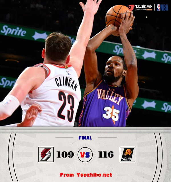 北京时间12月16日讯 NBA常规赛,开拓者对阵太阳,开拓者近况不加遭遇5连败,太阳上场比赛在杜兰特复出的帮助下力克爵士。开场后布克三分先声夺人,随后杜兰特接连砍分帮助太阳建立领先,开拓者多点开花紧追不舍,但第一节尾声太阳外线又是一波三分将分差拉大到两位数。第二节上来开拓者内外开花一路将分差追到只差2分,克林根内线连续上演暴扣,布克和奥尼尔先后命中三分为太阳止血。易边再战,开拓者延续反扑势头,上来就是一波11-0的攻势反超比分,布克内突外投连连砍分帮助太阳夺回领先。第四节太阳多点开花再度掀起攻势将分差拉大到两位数,虽然开拓者最后时刻一度又缩小分差,但时间所剩无几,最终太阳116-109送开拓者6连败。