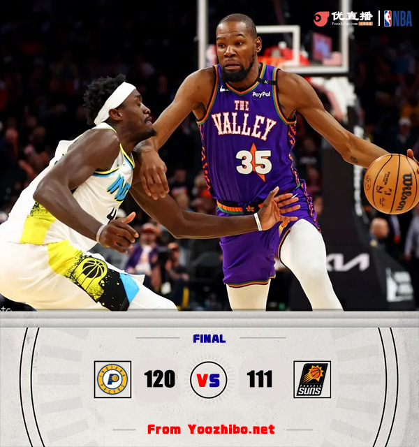北京时间12月20日讯 NBA常规赛,太阳今日迎战步行者,两队近来状态都可以,均是取得两连胜,此役比尔可以出战,内史密斯缺战。比赛上来,太阳率先进入状态取得领先,但随后他们陷入到近四分钟的得分荒,步行者趁势轰出一波14-0的攻势完成反超,之后的比赛太阳虽然一直紧咬比分却始终无法重夺领先,半场结束时步行者仍领先1分;下半场回来,步行者重新找到节奏,进攻端势如破竹单节再轰37分,分差也是拉开到了十分以上,对于太阳更为不利的是布克因腹股沟伤势提前退赛,末节步行者也没有再给对手任何机会,即便是杜兰特连续砍分也无济于事,最终步行者轻取太阳,迎来三连胜的同时也终结了后者的连胜。
