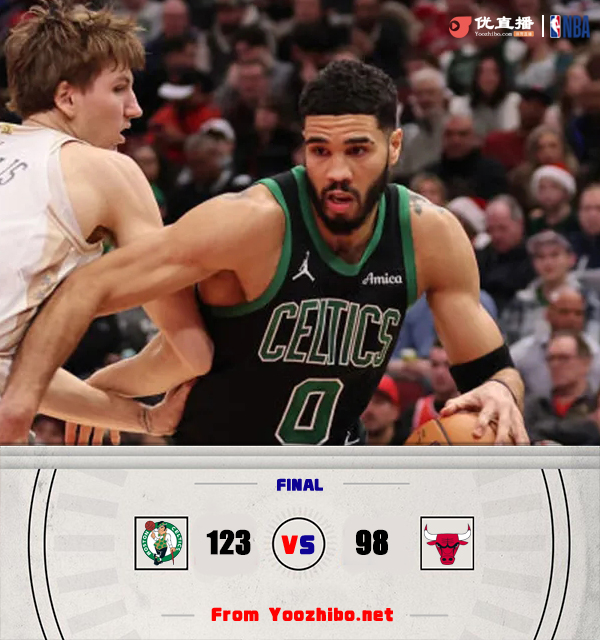 北京时间12月22日讯 NBA常规赛激战正酣,凯尔特人前往客场再战公牛,上场公牛客场击败对手迎来三连胜,凯尔特人主帅马祖拉赛后不满判罚怒喷主裁被罚款3.5万美元。此役一上来双方便陷入缠斗,布朗率先发力不断取分,公牛内外结合及时回应,两队你来我往比分始终紧咬,首节战罢双方战成28平,次节回来,公牛开局进攻出现停滞,凯尔特人持续发力,并在末段轰出10-0攻击波拉开比分,半场战罢,凯尔特人确立7分优势。易边再战后塔图姆连中三分狂揽18分,凯尔特人延续火力将分差越拉越大,三节结束后凯尔特人已经领先16分,末节上来,公牛进攻滞涩追分乏力,塔图姆手感滚烫提前终结悬念,双方早早换上替补阵容,最终凯尔特人123-98大胜公牛成功复仇。