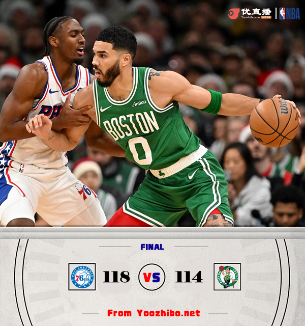 NBA圣诞大战,凯尔特人主场迎战76人,凯尔特人目前22胜7负高居东部次席,76人则是10胜17负排在东部第12位。本场比赛,霍勒迪缺阵。比赛开始,双方上来就下起三分雨,马克西里突外投迅速上双,恩比德接连内线强打建立主动权,但绿军依然靠三分回应,首节76人领先5分,次节双方再次三分对飚,马克西有攻有传带队15-2攻击波扩大到双位数领先,塔图姆里突外投连砍9分带队追分,恩比德接连中远投强势回应8分,半场76人还领先8分。下半场,双探花联手7-0追分,随后76人进攻端受阻,杰伦-布朗里突外投单节砍下14分助队直接反超比分,三节双方打成82平,末节马克西里突外投加助攻凯莱布-马丁三分,带领76人轰出18-2重新取得领先,塔图姆带队连续强杀回应11-0咬住比分,恩比德联手马克西止血,76人重新领先到两球以上,乔治和恩比德两罚全中杀死比赛,最终76人118-114力克凯尔特人。
