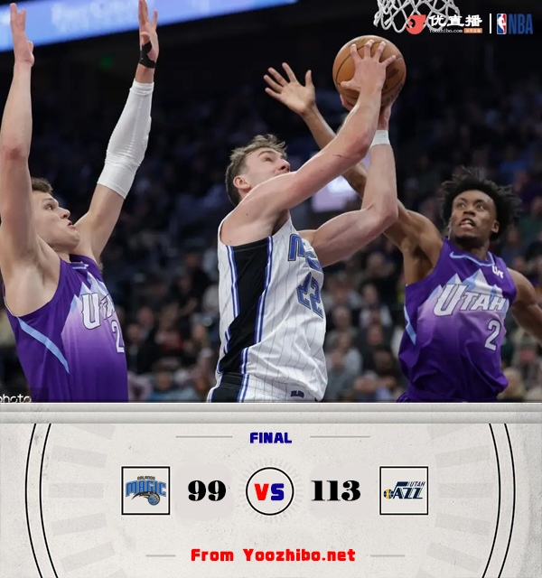 24直播网2月2日讯 NBA常规赛,爵士主场迎战魔术,爵士目前8连败后10胜36负西部垫底,魔术则是2连败后24胜25负排名东部第8。比赛开始,双方上来很是慢热,进攻端连续打铁,小瓦靠罚球止血,但爵士科林斯和凯斯勒接连送暴扣,马尔卡宁外线也接连发炮顺势拉开双位数领先,次节魔术进攻端继续不在状态,主力疯狂打铁,反倒是爵士多点开花扩大领先,席尔瓦抢断后压哨三分助队半场追到差12分。下半场,班凯罗进攻端还是铁,爵士抓住机会接连打成转换,一波8-0小高潮领先到20分以上,随后魔术接连罚球止血,三节魔术还落后16分,末节小瓦接连造杀伤罚球追分,但爵士总能回应一度又拉开20分以上领先,小瓦格纳里突外投单节砍下15分追分,但无奈分差太大,最终爵士113-99力克魔术,终止8连败同时送对手3连败。
