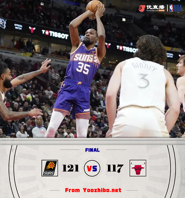 北京时间2月23日讯 NBA常规赛,公牛主场迎战太阳,公牛5连败后22胜34负东部第10,太阳4连败后26胜29负西部第11。比赛开始,太阳很慢热打了3分多钟才通过罚球拿到首分,半节多得分还未上双,公牛9-2开局后接连三分建立主动权,首节领先10分,次节双方展开拉锯战,公牛全民皆兵保持领先,但太阳三巨头轮番发力,助队单节轰出40分半场反超2分。下半场,布克继续发力里突外投单节轰下14分,比尔也接连突破取分领先到双位数,但公牛接连3记三分三节还是追到差3分,末节太阳上来7-0再次领先双位数,但公牛外线发炮还能咬住比分,怀特2+1直接追平,杜兰特接连罚球,布克三分再进,布克接连不讲理三分杀死比赛,最终太阳121-117力克公牛,终止4连败同时送对手6连败。