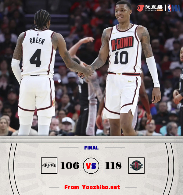 北京时间2月27日讯 NBA常规赛,火箭主场迎战马刺。火箭36胜22负排在西部第5,马刺24胜32负排在西部倒数第3。比赛开始,火箭率先发力,狄龙连中三分将分差拉开到两位数,马刺迟迟找不到感觉,火箭多点开花不断拉大分差,次节泰特三分一度帮助球队将优势扩大到20分,马刺连投带罚止住颓势,杰夫-格林连续拿分,半场战罢火箭64-46领先马刺。易边再战,火箭延续火力继续扩大优势,阿门连续补篮得手后三分也有,马刺连投带罚苦苦支撑,末节火箭稳扎稳打保持优势,马刺苦苦追赶无奈之前挖坑太大。最终,火箭118-106击败马刺,主场过关。