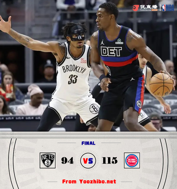 北京时间3月2日讯 NBA常规赛,活塞今日迎战篮网,前者上场比赛输给掘金,后者则是遭遇三连败,此役拉塞尔、小托马斯、克洛尼和艾维等人缺战。比赛上来,场上就呈现出一边倒的局势,篮网在半节的时间里只拿到4分,而活塞这边杜伦统治了攻防,在他的带领下球队也是打出19-4的完美开局,比斯利上场后连中三分,活塞单节轰下39分,次节活塞依旧占据着场上的主动权,分差也是突破了二十分,半场结束时篮网落后23分;下半场回来,活塞的进攻出现大问题,单节只拿到13分,尤其是三节节末连续出现失误被篮网追到个位数,末节活塞重整旗鼓,双方也是火药味十足,比斯利挑衅观众被驱逐,不过分差一直在十分以上,最终活塞轻取篮网,送给后者四连败。