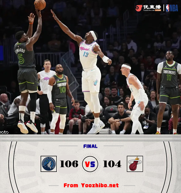 北京时间3月8日讯 NBA常规赛激战正酣,热火主场迎战森林狼,森林狼近期迎来三连胜,35胜29负紧追勇士位列西部第7,热火29胜32负排在东部第7。此役一上来双方便陷入缠斗,阿德巴约连投带罚不断取分,兰德尔联手康利及时回应,森林狼中段开始发力确立优势,首节结束时森林狼领先8分,次节回来,森林狼始终保持领先,但末段他们进攻突然断电,热火顺势抹平分差,半场战罢,两队战成52平。易边再战后森林狼再度发力将分差拉开到两位数,阿德巴约和希罗内外结合强势回应,双方战成80平进入末节,末节决战,两队鏖战至最后时刻,里德和麦克丹尼尔斯连中抛投,森林狼连丢罚球后阿德巴约三分绝杀未果,最终森林狼106-104涉险过关。