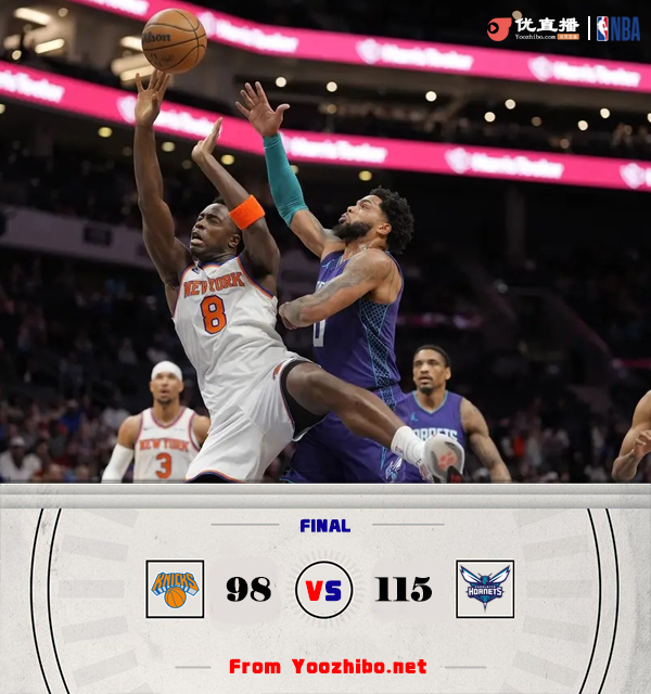 北京时间3月21日讯 NBA常规赛,尼克斯客场挑战黄蜂。尼克斯43胜25负高居东部第3,黄蜂17胜51负东部倒数第2。上半场,黄蜂率先发力打出9-2的开局,尼克斯内外开花反超比分, 黄蜂一波8-0稳住局势,次节双方围绕10分分差展开拉锯战,尼克斯不断冲击内线,黄蜂连投带罚强势回应,半场战罢尼克斯44-54落后黄蜂。下半场,黄蜂内外开花牢牢占据场上主动,尼克斯里突外投顽强追赶,末节两队继续围绕两位数的分差展开激烈争夺,黄蜂持续发力扩大优势,马威攻防两端建功,锡伯杜在比赛还剩2分钟时换下主力投子认负。最终,尼克斯98-115不敌黄蜂,客场落败。