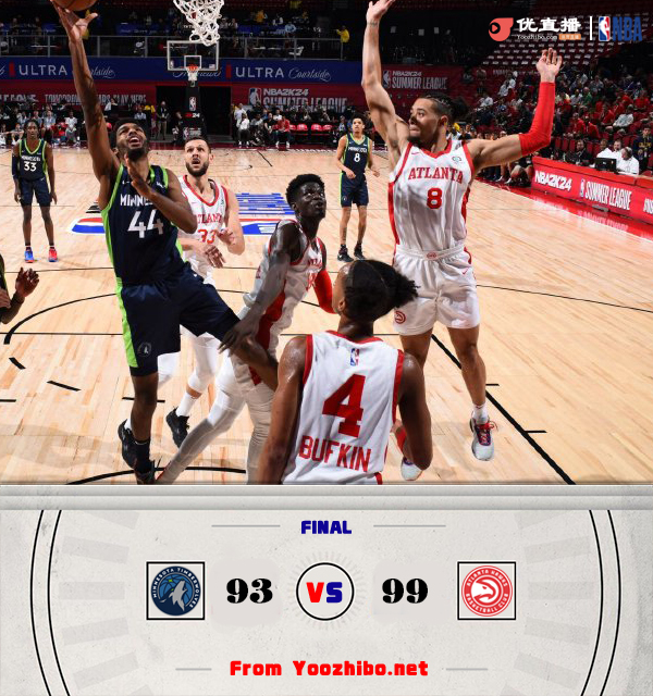 24直播网讯 7月13日讯 NBA夏季联赛,老鹰对阵森林狼。一开场,森林狼率先发力,连造杀伤开局9-2领先,老鹰轮番冲击篮筐拿分追赶,并且完成7-0的攻势反超比分,森林狼命中率持续下降,老鹰连中4记三分取得两位数优势,半场战罢老鹰50-40领先10分。下半场,双方围绕两位数的分差展开拉锯战,老鹰突然哑火,森林狼火力全开轰出24-7的进攻狂潮,此后老鹰及时回暖完成12-2的攻击波重夺领先,关键时刻泰瑞斯-马丁连投带罚拿到6分,老鹰虽连续罚球失手,但森林狼没能抓住机会。最终,老鹰99-93力擒森林狼。