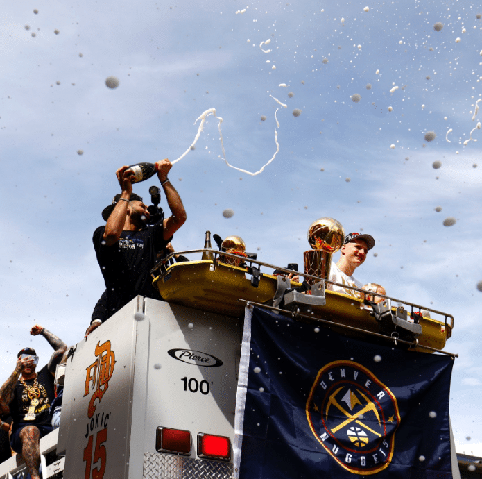 24直播网讯06月16日,掘金队正式举办夺冠游行庆典,现场出现意外,约基奇妻子的面部被砸到,所幸未受伤;究竟现场有多火爆?掘金球迷挤满路两侧,马龙、穆雷狂喷香槟以及波普对瓶吹嗨翻天,小布朗、布劳恩等人赤膊亮相。