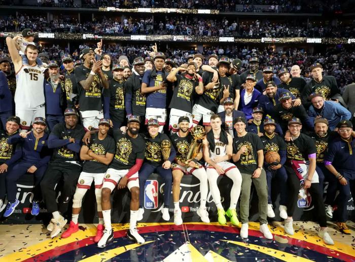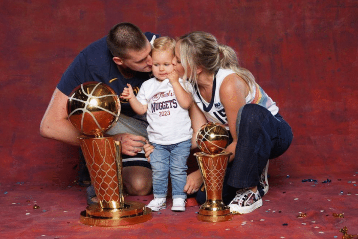 在今年总冠军颁奖仪式上,约基奇扛着女儿站在角落里,而且把MVP留在颁奖台上,最终掘金主帅马龙抱着约基奇的FMVP奖杯拍摄合影,穆雷抱着总冠军奖杯也坐在最显眼的位置;拍摄定妆照时,约基奇穿着大裤衩和拖鞋,和老婆孩子一起合影。