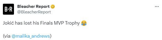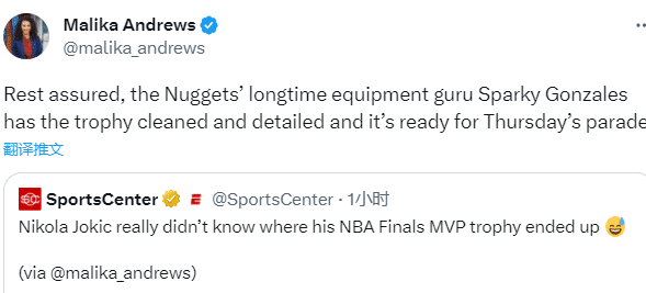 美媒BR和SportsCenter都转发约基奇找不到FMVP的言论,配文写道:约基奇已经弄丢了他的FMVP奖杯;美媒NBA Memes晒穆雷凯觎约基奇FMV奖杯一幕,调侃是穆雷是约基奇FMVP奖杯丢失的罪魁祸首;之后Malika Andrews回应此事,表示:请放心,掘金队装备经理Sparky Gonzales已经对奖杯进行了清洁处理,并为周五的夺冠游行典礼做好了准备。