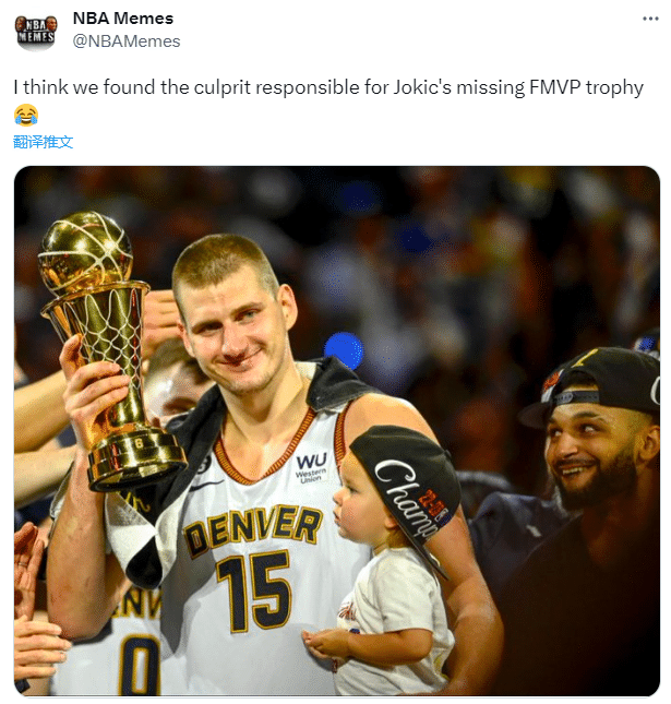 24直播网06月15日,NBA新科总冠军&FMVP得主约基奇接受名记的专访,期间约基奇表示他弄丢了他的FMVP奖杯,希望别人能把奖杯给他送回家;美媒晒穆雷凯觎约基奇奖杯一幕,调侃是穆雷偷走了;不过据名记报道,约基奇MVP已经找到了,并且准备好了参加夺冠庆典。