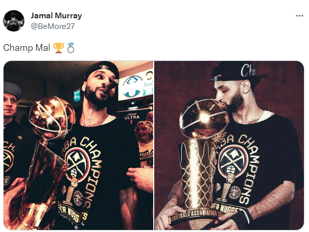 24直播网06月13日,据espn名记报道,掘金曾拒绝用穆雷换欧文的交易提议,如今时至今日,穆雷和约基奇带领球队夺得队史首冠,晒亲吻总冠军奖杯照再次庆祝夺冠。