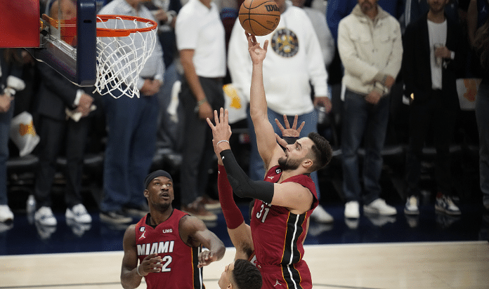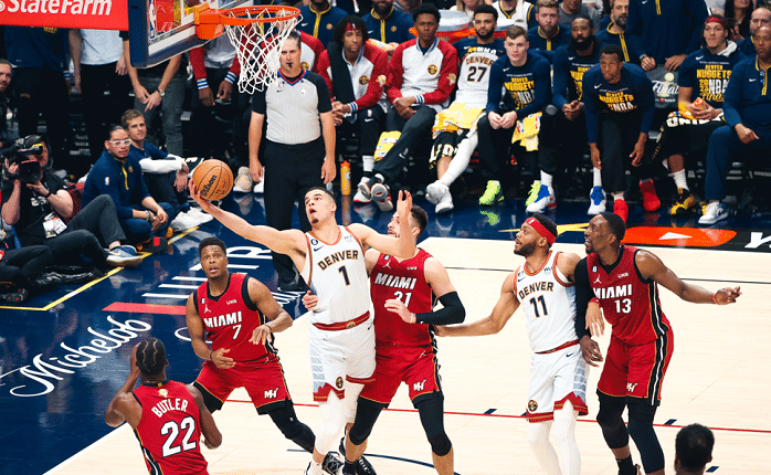 24直播网06月13日NBA总决赛G5展开争夺,赛前掘金3-1领先,此役回到主场只要赢球就可以夺得冠军,热火到了悬崖边,输球赛季结束,只有赢球才能将系列赛拖回到主场。上半场背水一战的热火51-44领先掘金,阿德巴约爆发,裁判的判罚引发争议。