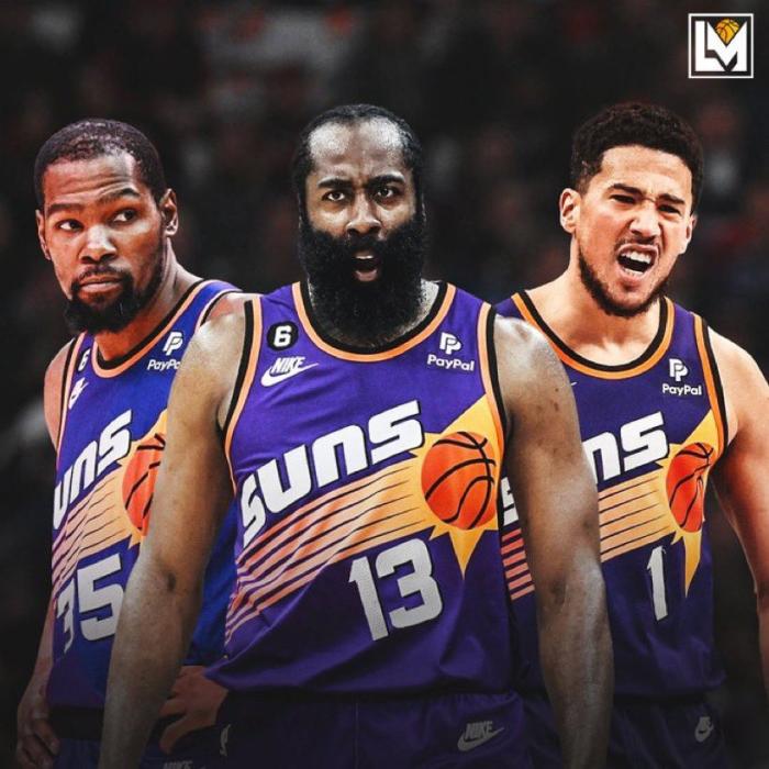 若哈登真的被交易到太阳,他就会和杜兰特重聚并且联手布克,杜登曾在篮网联手,不过篮网三巨头未能夺冠就早早解体;若哈登、杜兰特和布克联手,这就相当于是篮网时期的杜欧登三巨头。