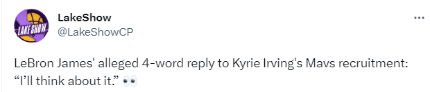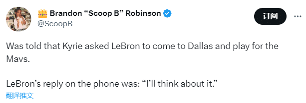 24直播网讯06月08日近日欧文招募詹姆斯加盟独行侠的重磅消息引发巨大热议,究竟当时詹姆斯是如何回应欧文的?NBA名记布兰登-罗宾逊爆料,当欧文招募詹姆斯前往独行侠打球时,詹姆斯在电话里回应:我会考虑的(I’ll think about it)。